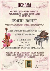 С настъпването на пролетта, Стара Загора ще се превърне в сцена на хармония, музика и красота. Общинско предприятие „Арт сцена – Стара Загора“, съвместно с Художествена галерия Стара Загора, има удоволствието да покани гражданите и гостите на града на специален камерен концерт, в който нежните струни на цигулката и клавишите на пианото ще преплетат емоциите на класическата музика, съобщиха за ЗАРАТА.