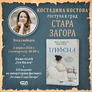 Къща музей „Гео Милев“ ще бъде домакин на среща с писателката Костадина Костова, която ще представи своя роман „Трифена“ пред старозагорската публика. Събитието ще се проведе на 2 април 2026 г. (четвъртък) от 18.00 ч.