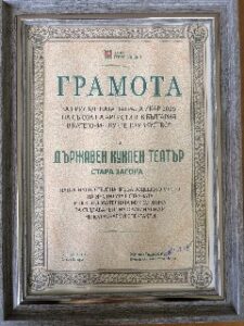 Кметът на Община Стара Загора Живко Тодоров връчи почетна грамота и художествена пластика на Държавния куклен театър Стара Загора по повод присъдената национална награда „ИКАР 2026“ на Съюза на артистите в България в категория „Куклен спектакъл“ за „Голямата шапка“.