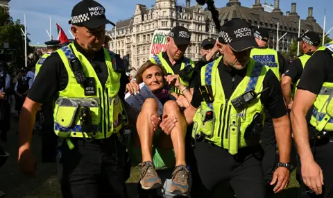 „Полицейски служители извършиха 92 ареста за изразяване на подкрепа за забранената организация. Арестуваните бяха на възраст от 27 до 82 години. Полицейските служители продължават да извършват арести, а групата протестиращи е на площад Трафалгар“, съобщи Столичната полиция.