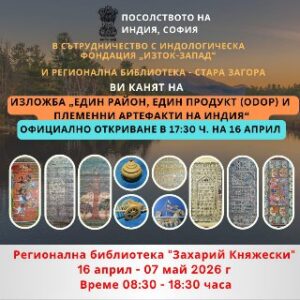 Изложбата „Един район, един продукт – племенни артефакти на Индия“ ще бъде открита на 16 април 2026 г. от 17.30 ч. в Регионална библиотека „Захарий Княжески“.