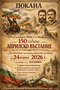 НЧ „Съзнание-1900“ в с. Казанка организира тържествено честване по повод 150-годишнината от Априлското въстание. Събитието ще започне на 24 април 2026 г. от 18.30 ч. в центъра на с. Казанка.