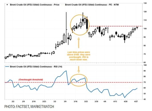 В късната следобедна търговия в понеделник RSI беше около 59.60. На 16 март, когато фючърсите на „Брент“ приключиха деня малко над 100 долара, RSI беше 71.28.