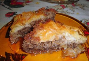 Необходими продукти: 1 пакет фини кори, 1 пакетче краве масло, 5 яйца, 3 ½ чаена чаша захар, 1 чаена чаша брашно, 1 чаена чаша орехи, 1 супена лъжица канела, 1 бакпулвер, 2 ванилии, 4 чаени чаши вода