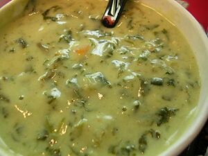 Необходими продукти: 5 картофа, 8 яйца, 2.5 л вода, 2 кубчета зеленчуков бульон, 450 гр замразен спанак, 2-3 стръка пресен лук, 2 глави кромид лук, дафинов лист, сол, магданоз, копър, 100 мл заквасена сметана