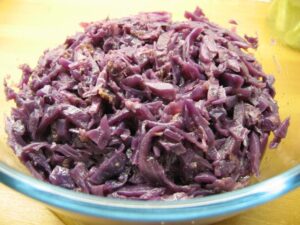 Необходими продукти: 1 червена зелка, 50 гр сол, 2 ½ светъл оцет, 1 супена лъжица карамфил, 1 супена лъжица бахар, 5 см пръчка канела, 6 зърна черен пипер, ¼ чаена лъжица настъргано индийско орехче
