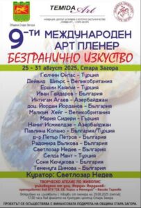 Форумът стартира в седмицата 25-31 август; участие в него ще вземат 16 творци от България, Турция, Азербайджан, Гърция и Великобритания Откриването на 9-я Международен арт пленер „Безгранично изкуство“ ще се състои на 29 август 2025 г. (петък) във фоайето на Културен център Стара Загора, от 17.00 ч.