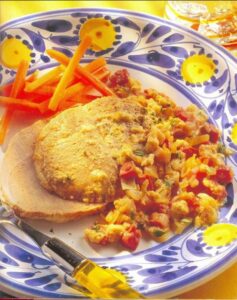 Стъпка 4: Върху всяка пържола се подреждат внимателно сварените зеленчуци, чушката, нарязана на кръгчета и тънка плочка кашкавал, така че да покрие горната площ.