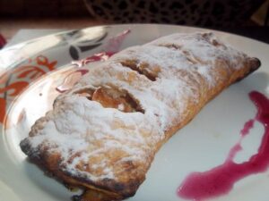 Приготвяне: Тестото се разточва на правоъгълник и се нарязва на ленти широки 15-18 см. От настърганите и изстискани ябълки, захарта, канелата, галетата и ореховите ядки се приготвя плънката, която се разстила по средата на лентите. Единият край на лентата се намазва с разбитото яйце и върху него похлупва другия край. Лентите с плънката се намазват с яйце и се поставят в навлажнена с вода тава. Щруделът се пече в силна фурна до светлокафяво оцветяване. След изваждането му от фурната се поръсва с пудра захар и се нарязва, когато поизстине.
