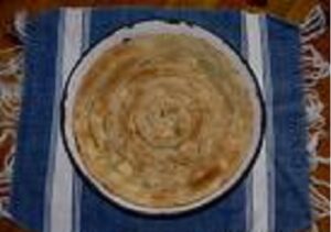 Стъпка 3: Всяка кора се сгъва на четириъгълник и се навива на руло. Поставят се в намаслена кръгла тава. След като се нареди цялата баклава, отгоре се поръсва с разтопено масло и се пече в умерена фурна, докато се зачерви.