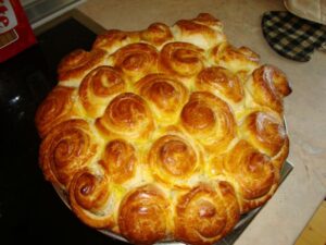 600 гр. брашно, 1 пакетче прясно масло, 3 яйца, 150 гр. захар, 1 чаена чаша прясно мляко, 10 гр. мая, 1 пакетче ванилия, 1 лимон.