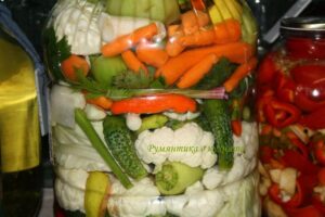 ПРИГОТВЯНЕ: На дъното на всеки буркан се слагат продуктите за маринатата. Върху тях започват да се нареждат на пластове изчистените зеленчуци, като добре се натискат с ръка, за да се наредят плътно.