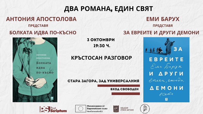 На 3 октомври (петък) от 19.30 ч. той ще бъде представен в разговор между Антония Апостолова и Еми Барух („За евреите и други демони“), в който ще се кръстоса написаното от двете, за да изградим заедно един по-цялостен свят. Мястото е Регионална библиотека „Захарий Княжески“.