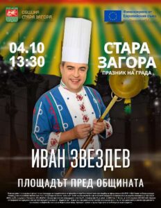 След концерта, на сцената ще се появи един от най-прочутите български кулинари и лице на много ТВ-предавания, посветени на изкусното приготвяне на апетитна храна. Иван Звездев ще зарадва своите почитатели от Стара Загора с кулинарно шоу. Предварително може да издадем, че той ще приготви пиле с булгур по градинарски и бърза туршия.