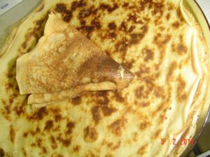 Продукти: 8 палачинки (приготвени по някоя от предишните рецепти), 100 гр. краве сирене, 40 гр. пушено сирене, 40 гр. кашкавал, 2 супени лъжици ситно нарязан магданоз, 1 яйце, галета, черен пипер на вкус.