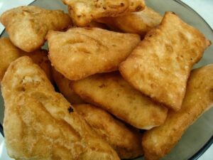 Приготвяне: Маята се разтваря в млякото. Прибавят се маслото, захарта, жълтъците, солта и брашното. Замесва се козуначено тесто, което се оставя да втаса. Разточва се кора с дебелина 1 см и с чаша се изрязват кръгчета. Слага се от пълнежа. Прегъват се на две и се притискат краищата, за да залепнат. Така приготвените бухти се нареждат в тава, посипана с брашно, и се оставят да втасат, след което се пържат в повече мазнина. Отгоре се поръсват с пудра захар.