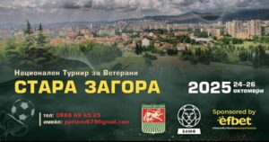 В същите дни от 24 до 26 октомври Стара Загора ще стане домакин и на Националния турнир по мини футбол за ветерани. Срещите ще се играят на спортен комплекс „Колодрума“, а началото е в петъчния ден от 17.00 ч. Традиционното събитие събира отбори от цялата страна и предлага истински футболни емоции. Организатор е Българската асоциация по мини футбол (БАМФ).