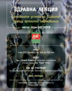 Здравна лекция на тема „Лечебните успехи на билките срещу хронични заболявания“ ще помогне на любителите на натуралния начин на живот да живеят по-пълноценно и природосъобразно. Лекцията ще се състои на 5 юли 2025 г. (събота), с подкрепата на Община Стара Загора, при вход свободен, от 14.00 ч. в Регионална библиотека „Захарий Княжески“.