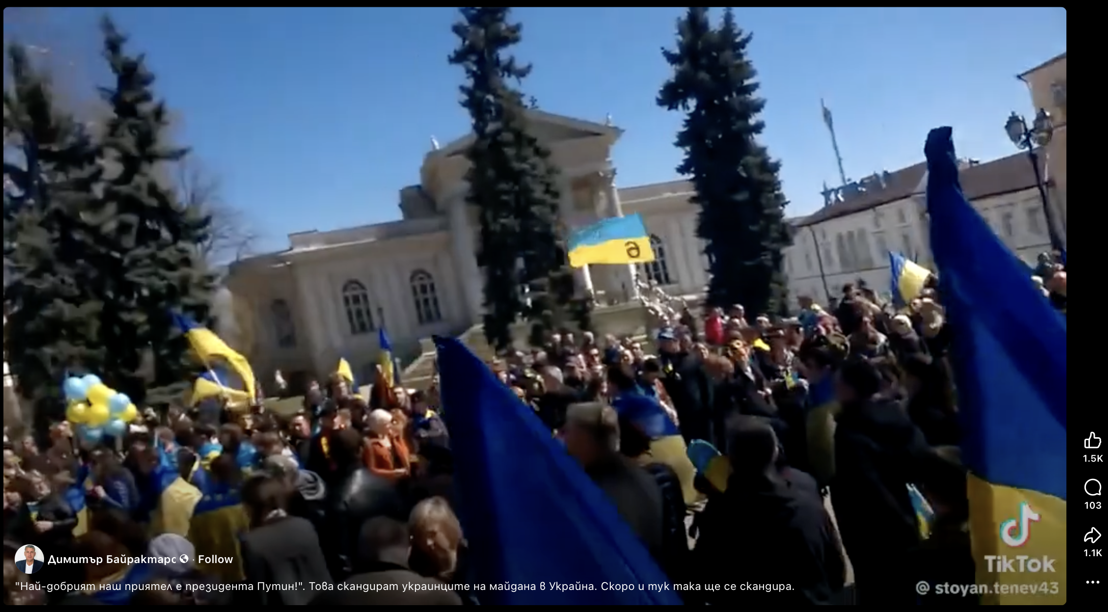 В социалните мрежи се разпространява видео от протест на украинци, за който се твърди, че е вподкрепа на Путин. На кадрите се вижда тълпа от хора, държащи украински знамена, които скандират „Най-добрият наш приятел е президентът Путин“.