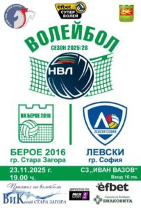 Стара Загора ще бъде домакин на един от най-атрактивните двубои в мъжкото волейболно първенство. На 23 ноември 2025 г. /неделя/ от 19.00 ч. в спортна зала „Иван Вазов“ местният ВК „Берое–2016“ ще посрещне отбора на ВК „Левски“ София. Очакванията са за динамична и оспорвана среща, която да предложи силни спортни емоции.