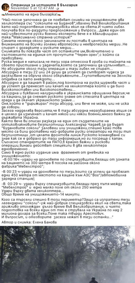 От началото на ноември в социалните мрежи се разпространява снимка, за която се твърди, че показва хеликоптери на украинското военно разузнаване, свалени от руски дронове. Снимката и описанието към нея са качени от профил, който не за пръв път разпространява руска дезинформация. Публикацията събира стотици реакции и е споделена в някои от най-големите проруски групи като „Приятели на В.В.Путин в България, Европа и света“, „Подкрепа за Путин срещу САЩ“, „България и Русия- братски съюз!“, където потенциално е достигнала до над 200 хил. потребители.