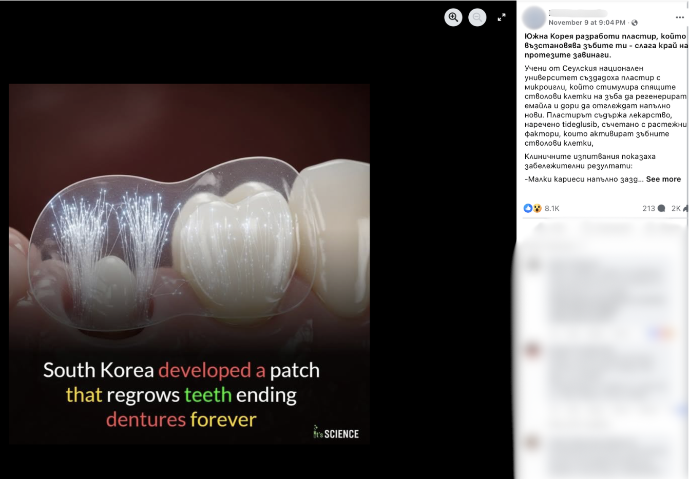 През последния месец във Фейсбук се разпространява публикация, според която изследователи от Южна Корея са разработили революционна медицинска технология, която лекува успешно кариеси за период от 4 до 6 седмици, възстановява нарушения емайл на увредени зъби за 8 седмици и предизвиква растеж на нови зъби. В публикацията се казва, че регенерацията на зъбите става чрез „пластир с микроигли“, който през 2026 г. ще да бъде разпространен по-широко.