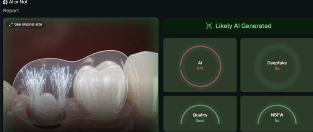 Проверка с детектор за изкуствен интелект показва, че снимката към публикацията за регенерирането на зъби също е създадена по този начин. В публикацията не се отбелязва, че изображението има илюстративен характер, което би могло да доведе до заблуда.