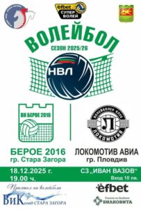 На 18 декември 2025 г. (четвъртък) от 19.00 часа в спортна зала „Иван Вазов“ в Стара Загора ще се проведе волейболна среща при мъжете между отборите на ВК „Берое 2016“ и ВК „Локомотив Авиа“ (Пловдив).