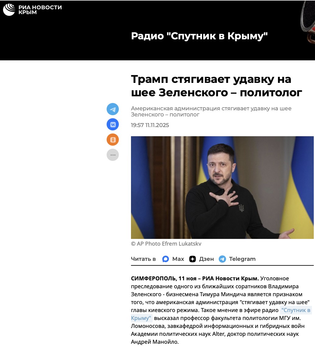 Разказът за корупционния скандал в Украйна като дело на САЩ преобладава в руските проправителствени медии, които го отразяват със заглавия като „САЩ направиха това, от което Зеленски най-много се страхува“ или „Тръмп затяга примката около врата на Зеленски“.