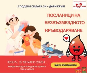 В Международен младежки център – Стара Загора на 27 януари от 18.00 ч. ще се проведе обучение за Посланици на безвъзмездното кръводаряване, насочено към млади хора, готови да бъдат глас на една от най-хуманните каузи – спасяването на човешки живот.