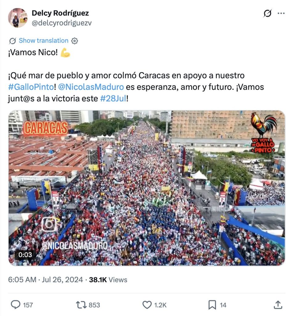 „Каракас, направихме го отново, по улиците открай докрай, по всяка улица и магистрала на #СтолицатаНаРепубликата. Хората са по улиците и никой не може да ги спре! Всички обединени, скандират: „Победа, победа, #ПобедаНаНарода“, гласи текстът под видеото. То е заснето на 25 юли 2024 г. в столицата на Венецуела Каракас и показва закриването на предизборната кампания на Николас Мадуро за президентските избори, които се проведоха на 28 юли същата година.