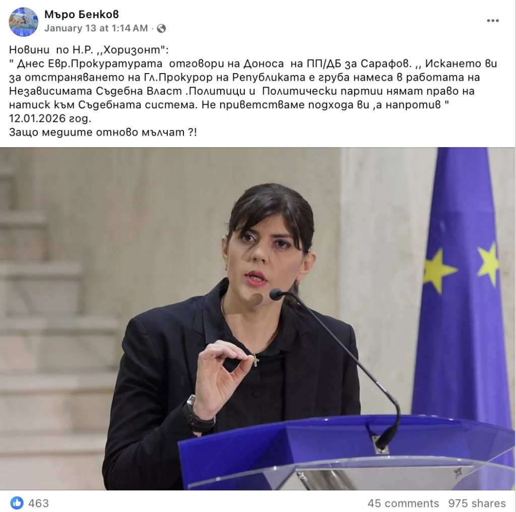 Твърдението е публикувано от профил с име „Мъро Бенков“, който е създаден през 2024 г. и първоначално разпространява съдържание, посветено на цар Борис Трети, но от декември 2025 г. започва да публикува само политическо съдържание, насочено основно срещу ПП-ДБ, кмета на София Васил Терзиев и президента Румен Радев. Публикацията му за Европейската прокуратура има близо хиляда споделяния и стотици коментари, включително в групи като „ИМПИЙЧМЪНТ ЗА пРЕЗИДЕНТА РАДЕВ“ и „Армията на Делян Добрев-фен група“. В нея не е посочен източник, липсва и линк към изявление на Европейската прокуратура. За достоверност обаче към твърдението е прикачена снимка на европейския главен прокурор Лаура Кьовеши.