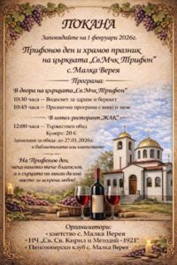 Старозагорското село Малка Верея ще отпразнува Трифоновден на 1 февруари 2026 г. Организатори на събитието са Кметството на с. Малка Верея, НЧ „Св. Св. Кирил и Методий-1921“ и Пенсионерски клуб с. Малка Верея с подкрепата на Община Стара Загора.