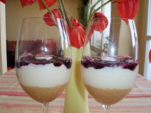 Стъпка 5: В наполовина пълните купички се слага ред от плодовете и се довършва с крем. Слагат се в хладилник. Преди поднасяне се обръщат в чинийки и се аранжират с плодовия сироп.