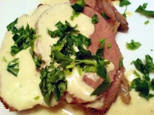 Стъпка 4: Месото се залива с получената смес. Вари се още 5 минути. Стъпка 5: Всяка порция се поднася поръсена с 2 лъжици сметана.