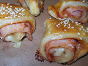 Приготвяне: Тестото се разточва на правоъгълен лист, който се разделя на еднакви правоъгълници. Две от страните им се намазват с разбито яйце, а в средата им се слага плънка и се завиват на рулца. Рулцата се нареждат на достатъчно разстояние едно от друго, защото ще бухнат при печенето, върху навлажнена тава и се пекат при умерена температура (180-200 С). Подходящо е да се поднесат със сирене, месен сос или горчица.