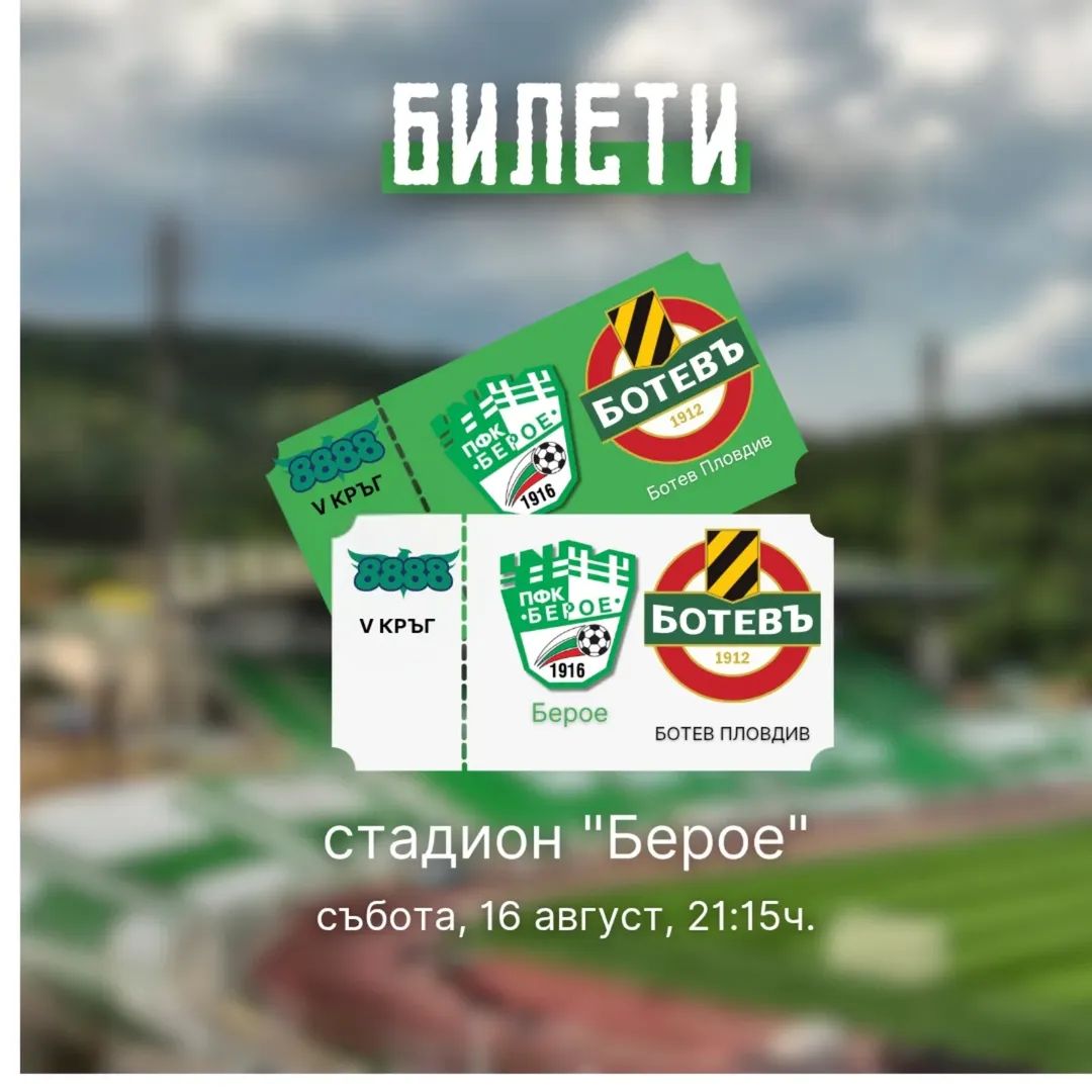 ПФК Берое пусна в продажба билетите за двубоя с Ботев Пловдив, научи ЗАРАТА. Срещата от V кръг на шампионата е насрочена за 16 август, събота от 21:15ч. Цената на билета за мача е 15 лв. в предварителна продажба и…